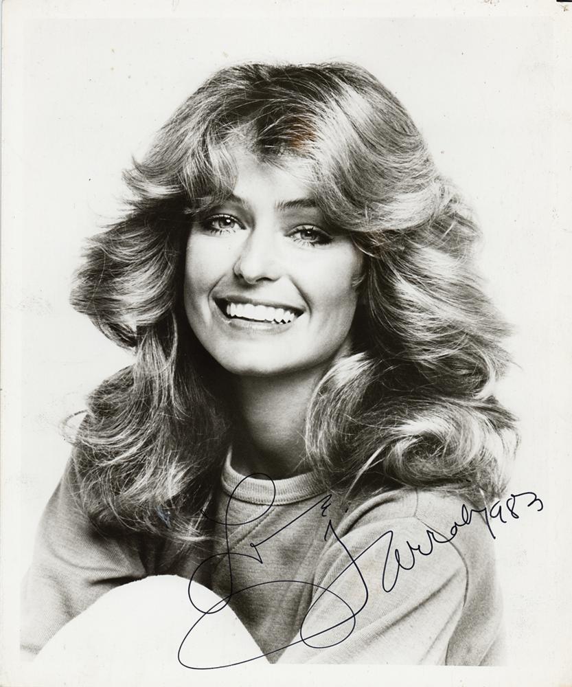 Classic glossy 8 x 10 photo of the blonde TV superstar, signed in black felt tip, "Love, Farrah, 1983." In very good to fine condition, with scattered light creasing.
