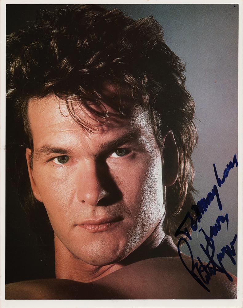 Color glossy 8 x 10 close-up photo of the Dirty Dancing star, signed and inscribed in blue felt tip, "To Mary Lou, Patrick Swayze.” In fine condition, with a tiny crease touching Swayze's lower lip.