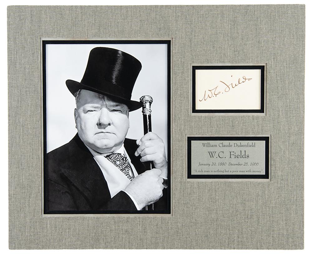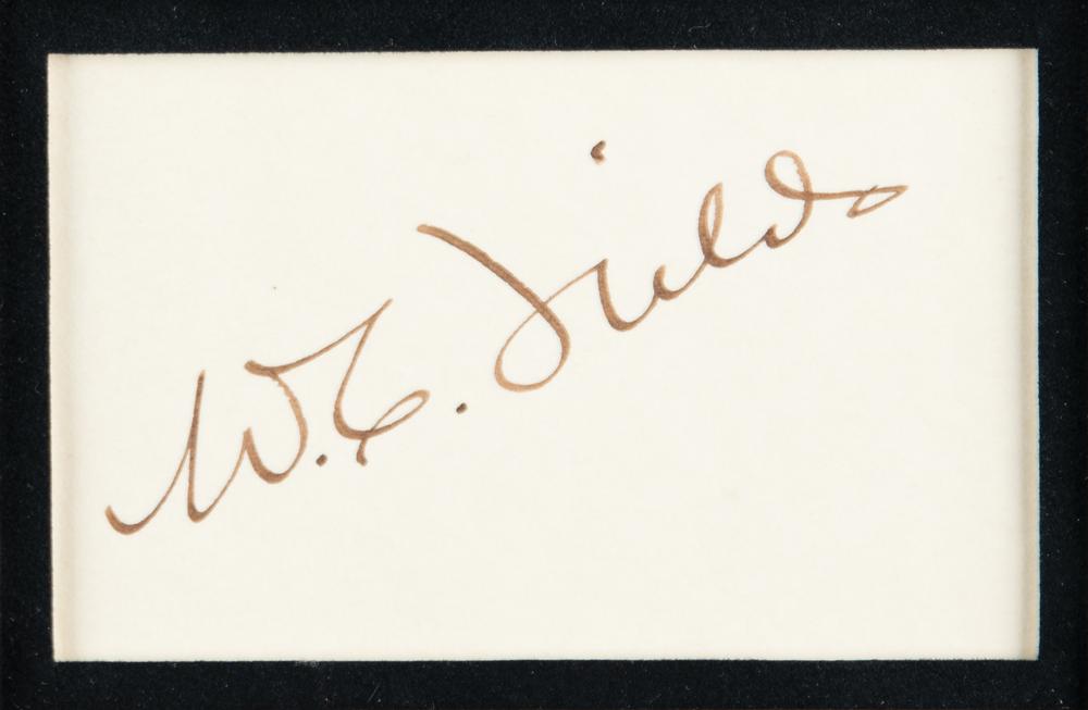 Vintage fountain pen signature, "W. C. Fields,” on an off-white 3.25 x 2 slip, nicely triple-matted with a portrait and nameplate to an overall size of 15 x 12.5. In fine condition.