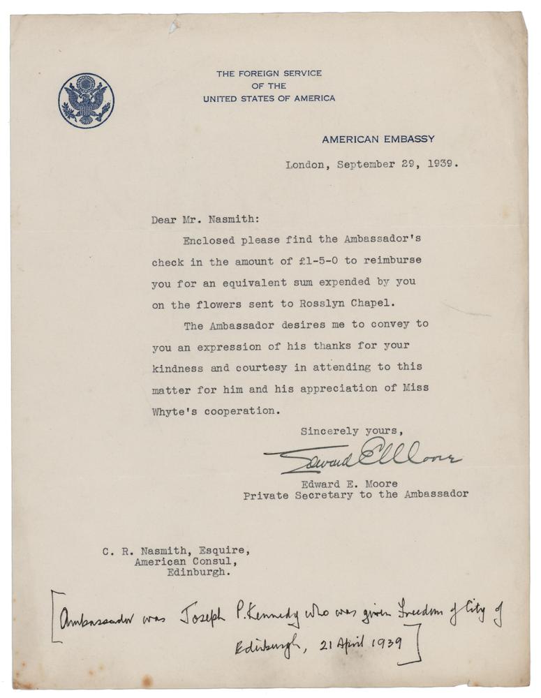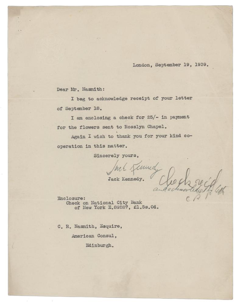 TLS signed “Jack Kennedy,” one page, 8 x 10.5, blindstamped American Embassy letterhead, September 19, 1939. Letter to Charles R. Nasmith, American Consul at Edinburgh, pertaining to a wreath sent for the memorial of Peter George Alexander St. Clair-Erskine, who had been killed while in active service with the Royal Air Force on September 8, 1939, one week after German forces invaded Poland, an event that triggered the start of World War II. In full: "I beg to acknowledge receipt of your letter of September 18. I am enclosing a check for 25/- in payment for the flowers sent to Rosslyn Chapel. Again I wish to thank you for your kind co-operation in this matter." The deceased airman was the brother of John F. Kennedy's friend Anthony St Clair-Erskine, 6th Earl of Rosslyn. In very good to fine condition, with light creasing, and staple holes and a small stain to the upper left corner.