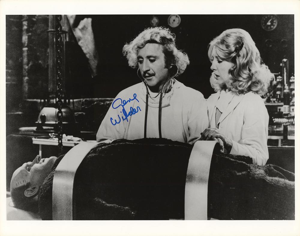Satin-finish 14 x 11 photo of Gene Wilder as Dr. Frederick Frankenstein in Mel Brooks' 1974 horror comedy Young Frankenstein, signed in blue felt tip. In very fine condition.