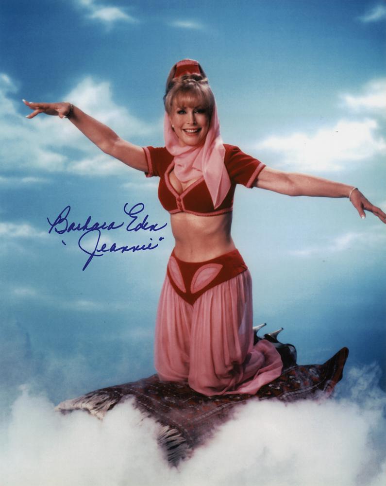 Glossy 8 x 10 photo of Eden in her starring role in the sitcom I Dream of Jeannie, signed in blue felt tip, "Barbara Eden, 'Jeannie.'" In fine condition. Originally obtained by in-person specialist Mike Wehrmann.