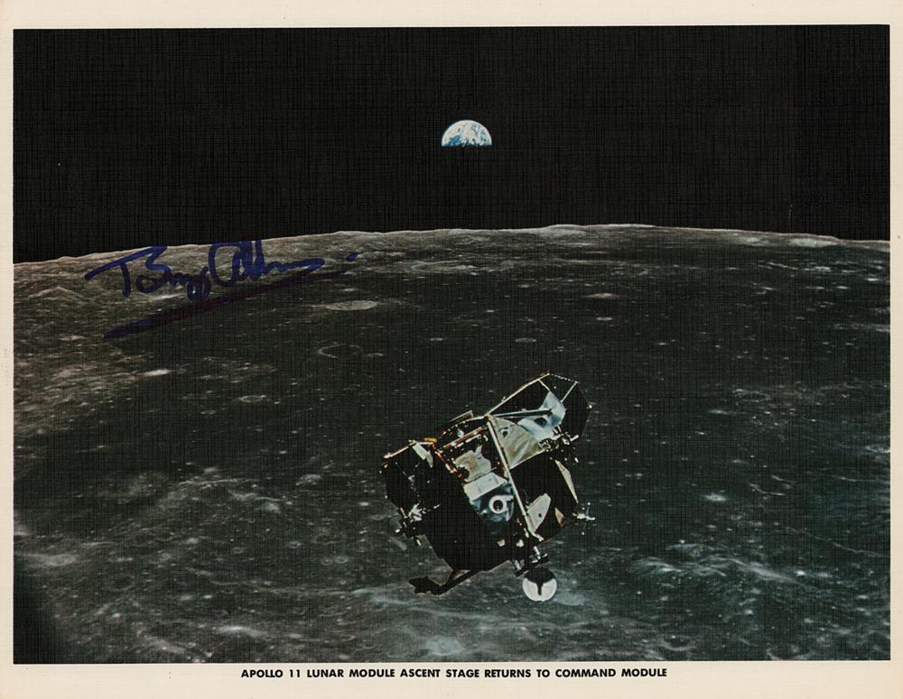 Color 10.75 x 8.5 textured lithograph of the Apollo 11 Lunar Module Ascent Stage returning to the Command Module, signed in blue felt tip, "Buzz Aldrin." In fine condition.