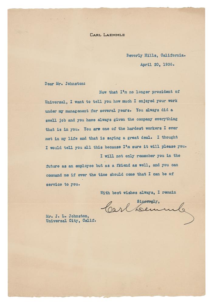 Film-making pioneer (1867-1939) and founder of Universal Studios. Laemmle and his son were responsible for the fantastic string of classic Universal horror films including Phantom of the Opera, Frankenstein, Dracula, and The Mummy. TLS, one page, 7.25 x 10.5, personal letterhead, April 20, 1936. Letter to well-known Hollywood stills photographer and publicity director John LeRoy Johnston, in part: "Now that I'm no longer president of Universal, I want to tell you how much I enjoyed your work under my management for several years. You always did a swell job and you have always given the company everything that is in you. You are one of the hardest workers I ever met in my life and that is saying a great deal. I thought I would tell you all this because I'm sure it will please you." In fine condition.