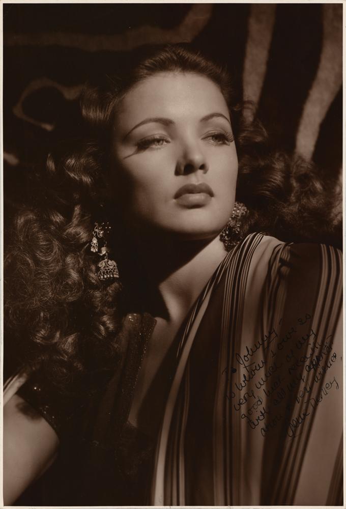 Striking vintage matte-finish 9 x 13.5 photo of the actress in a beautiful bust-length pose, signed and inscribed in fountain pen to well-known Hollywood stills photographer and publicity director John LeRoy Johnston, "To Johnny—To whom I owe so very much of my good luck recently—with all my appreciation & best wishes, Gene Tierney.” In fine condition.