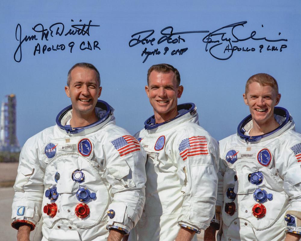 Color satin-finish 10 x 8 photo of the crew of the Apollo 9 mission posing together outdoors in their white space suits, signed in black felt tip, "Jim McDivitt, Apollo 9 CDR," "Dave Scott, Apollo 9 CMP," and "Rusty Schweickart, Apollo 9 LMP." In very fine condition.
