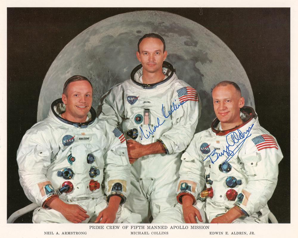 Official color 10 x 8 NASA lithograph of the Apollo 11 crew posing in their white space suits against a lunar backdrop, signed neatly in blue ink by Buzz Aldrin and Michael Collins. In very fine condition.