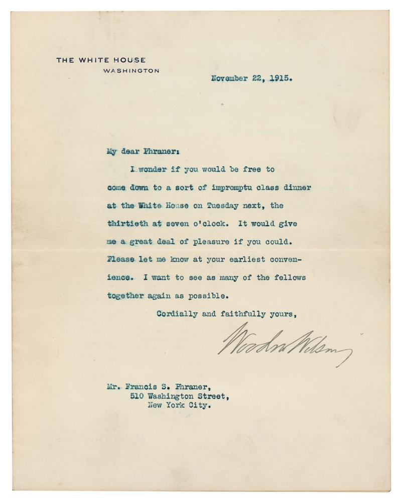 TLS, one page, 7 x 8.75, White House letterhead, November 22, 1915. Letter to Francis S. Phraner, in full: "I wonder if you would be free to come down to a sort of impromptu class dinner at the White House on Tuesday next, the thirtieth at seven o'clock. It would give me a great deal of pleasure if you could. Please let me know at your earlier convenience. I want to see as many of the fellows together again as possible." In fine condition.