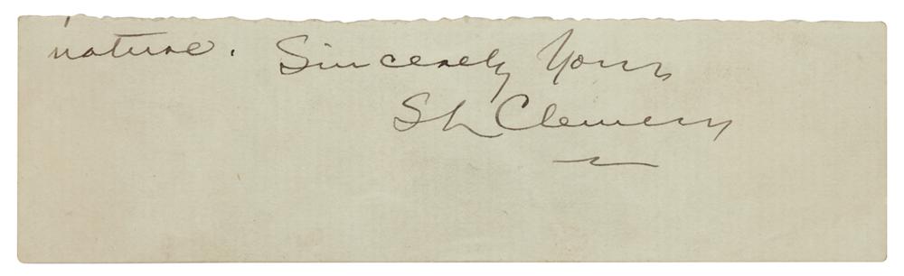 Fountain pen signature, "Sincerely yours, S. L. Clemens,” on an off-white 5.5 x 1.5 slip clipped from the close of a letter (also retaining the word "nature" in Clemens's hand). In fine condition. Accompanied by a full letter of authenticity from Beckett Authentication Services.