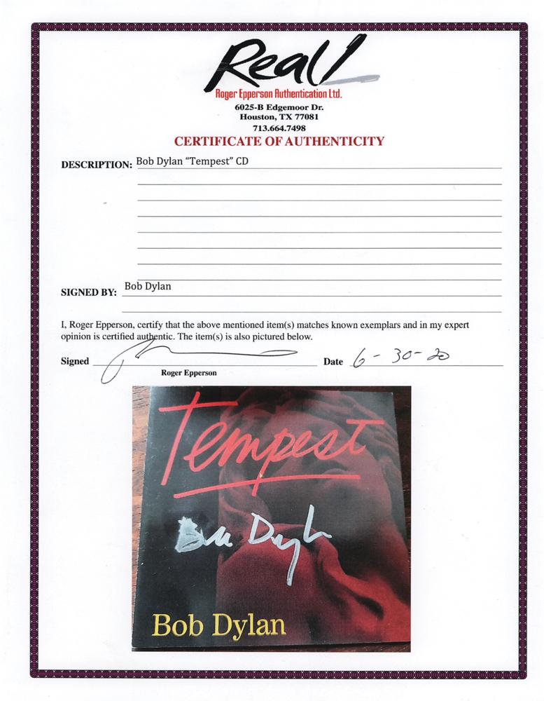 Tempest CD booklet signed on the front cover in silver ink by Bob Dylan. In fine condition, with a smudge to the first letter of Dylan's autograph. Accompanied by a full letter of authenticity from REAL.