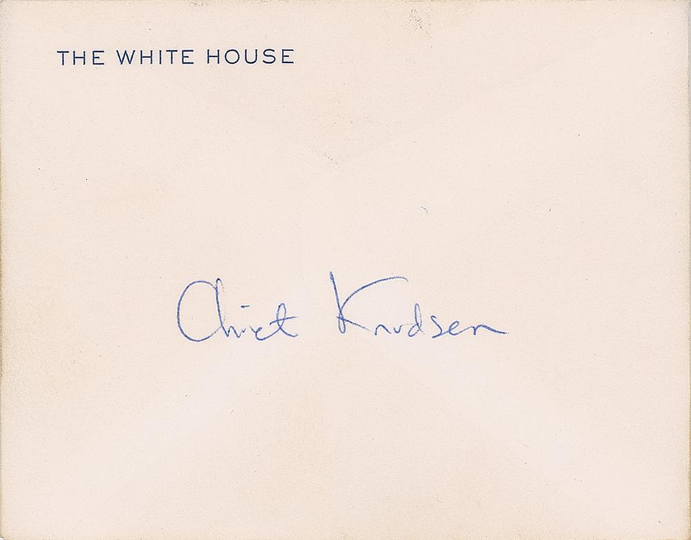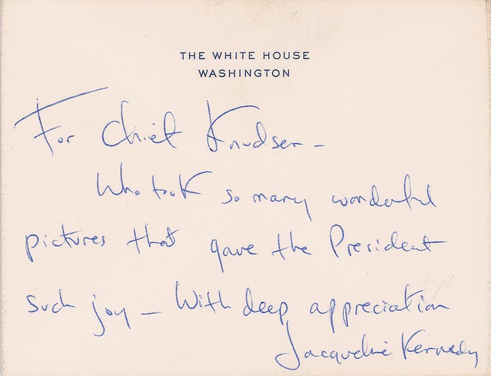 ANS as first lady, penned on a 4.5 x 3.5 White House stationery card, no date. Brief letter to White House Chief Photographer Robert Knudsen, in full: "Who took so many wonderful pictures that gave the President such joy—with deep appreciation." In fine condition. Accompanied by the original envelope annotated by Kennedy.
