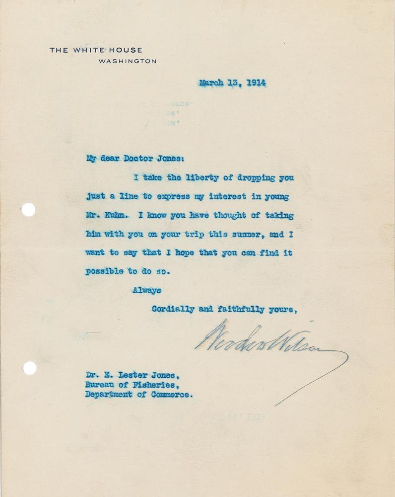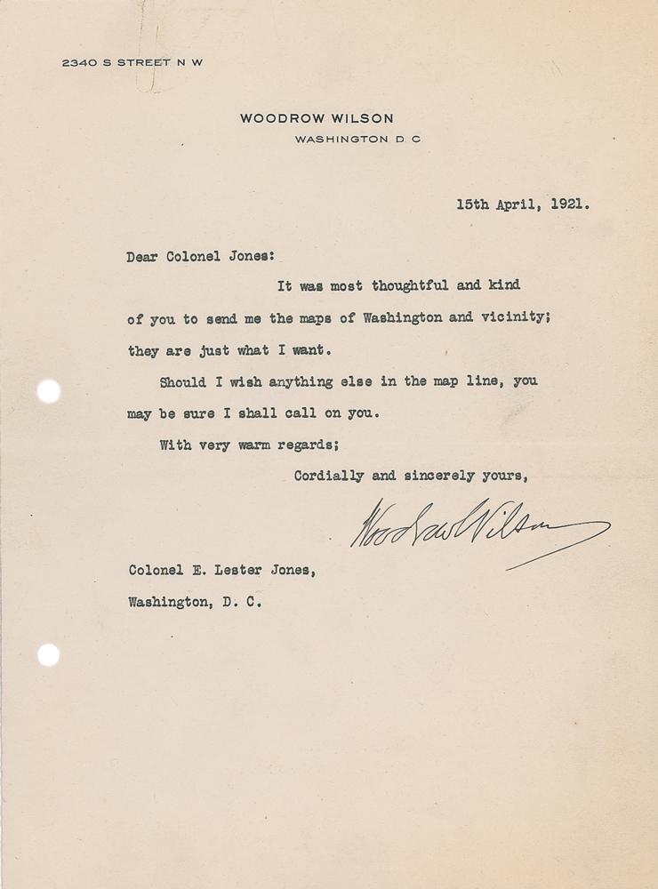 Two letters by Woodrow Wilson to E. Lester Jones: a TLS as president, one page, 7 x 8.75, White House letterhead, March 13, 1914, in part: "I take the liberty of dropping you just a line to express my interest in young Mr. Kuhn. I know you have thought of taking him with you on your trip this summer, and I want to say that I hope that you can find it possible to do so"; and a TLS, one page, 7 x 9.5, personal letterhead, April 4, 1921, in part: "It was most thoughtful and kind of you to send me the maps of Washington and vicinity; they are just what I want. Should I wish anything else in the map line, you may be sure I shall call on you." In fine condition, with two file holes to the left edge of each letter.