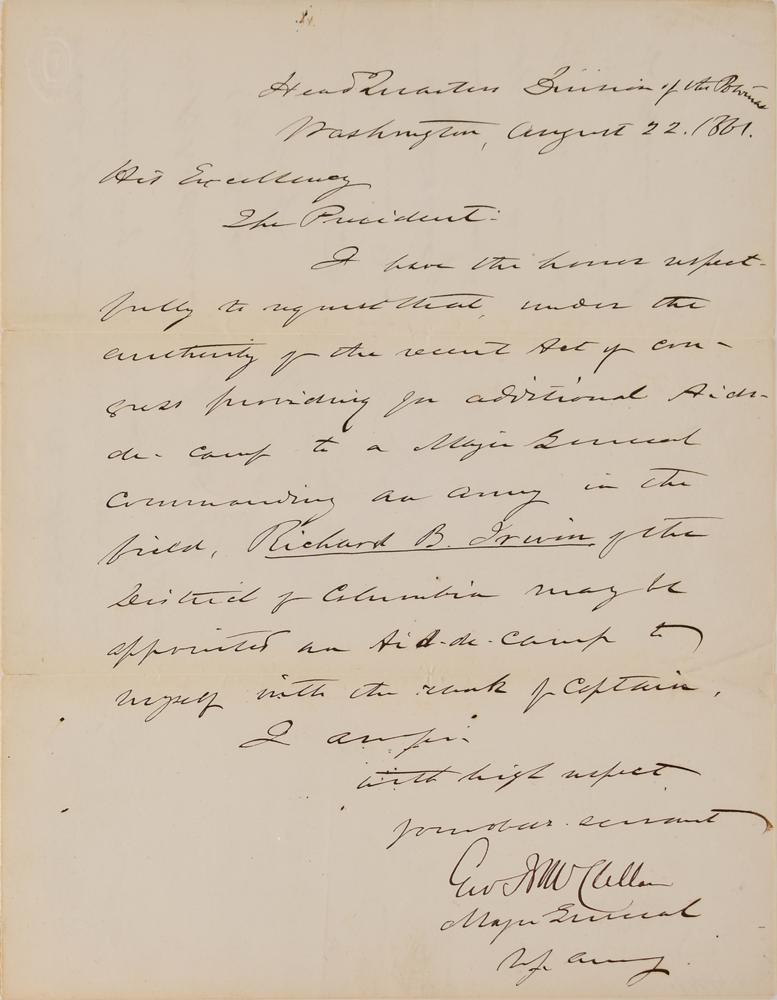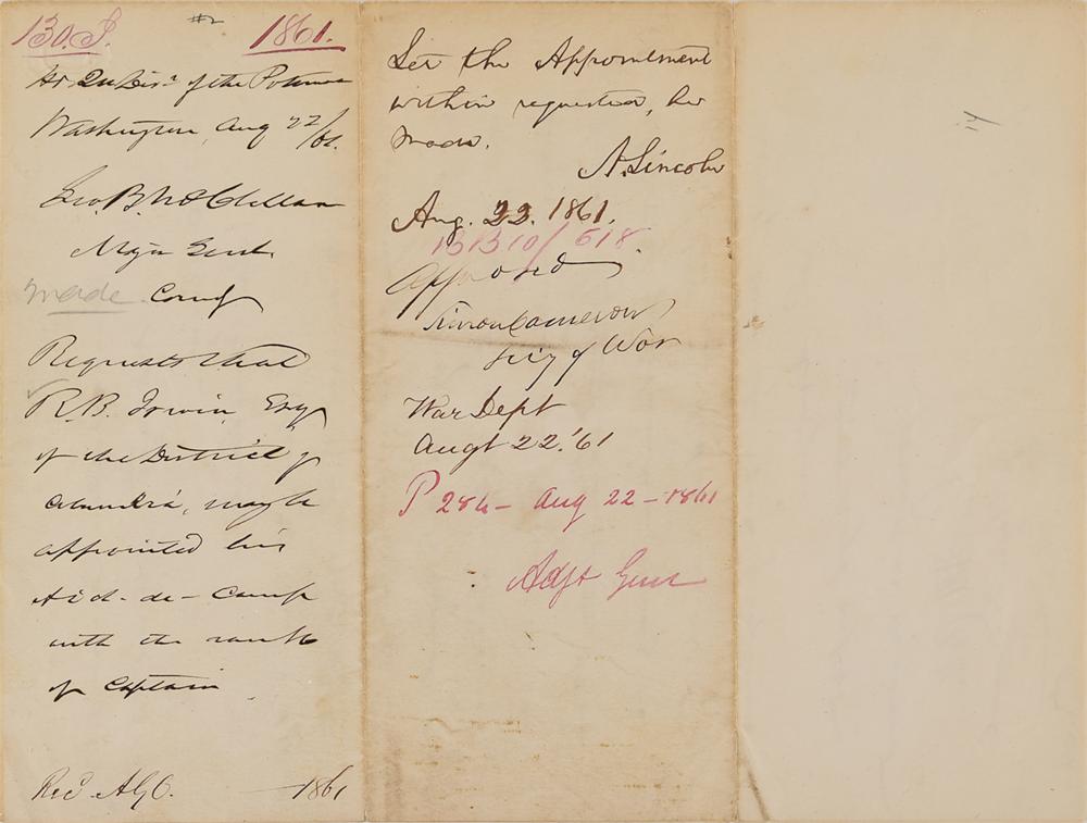 Exceedingly desirable and boldly penned Civil War-dated autograph endorsement as president, signed "A. Lincoln," penned on the reverse of an LS addressed to President Abraham Lincoln by Major General George B. McClellan, signed “Geo. B. McClellan,” dated August 22, 1861. McClellan’s letter, in part: "I have the honor respectfully to request that, under the authority of the recent Act of Congress providing for additional Aids-de-camp, to a Major General commanding an army in the field, Richard B. Irwin of the District of Columbia may be appointed an Aid-de-camp to myself with the rank of captain.” Lincoln's endorsement, in full: "Let the Appointment within requested be made. A. Lincoln. Aug. 23, 1861.” Countersigned below by Secretary of War Simon Cameron. In very good to fine condition, with splitting to the folds and almost complete separation to the hinge.