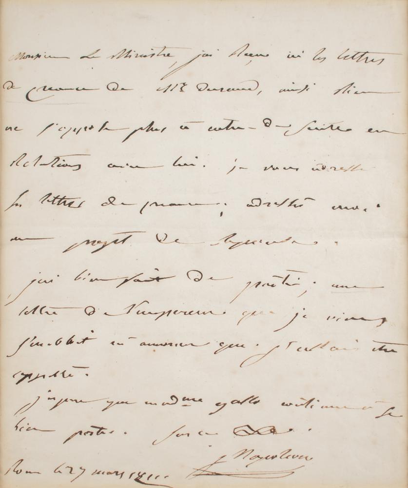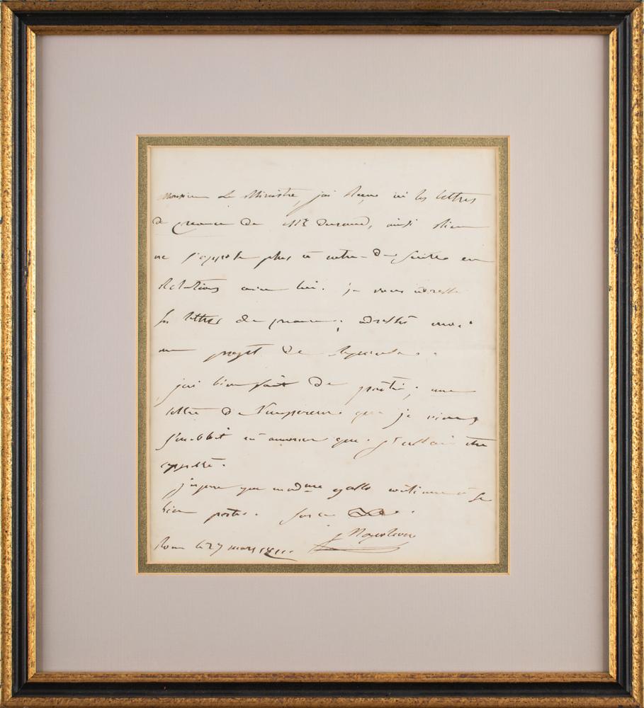 Brother-in-law of Napoleon Bonaparte (1767-1815) who was a marshal in Napoleon's regime and who reigned as King of Naples from 1808 to 1815. ALS in French, signed “J. Napoleon,” one page, 7.75 x 9.25, March 27, 1811. Untranslated letter to a government minister. Double-matted and framed to an overall size of 14 x 15.5. In fine condition.