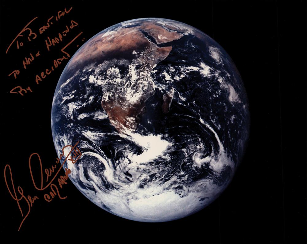 Desirable color glossy 14 x 11 photo of the famous 'Blue Marble' image of Earth taken by the Apollo 17 crew, signed in copper paint pen, "To[o] beautiful to have happened by accident, Gene Cernan. Apollo XVII." In fine condition.