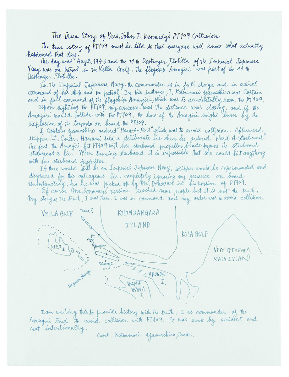 Japanese naval officer who commanded the 11th Flotilla (1900-1986) and who was Senior Officer on board the destroyer Amagiri on the night of the collision with John F. Kennedy's PT-109. Three items signed by Katsumori Yamashiro, including a detailed handwritten manuscript and two commemorative covers. The manuscript, signed "Capt. Katsumori Yamashiro, Cmdr.," is one page, 8.5 x 11, and headed: "The True Story of Pres. John F. Kennedy's PT 109 Collision." In part: "The true story of PT 109 must be told so that everyone will know what actually happened that day. The day was Aug. 2, 1943 and the 11th Destroyer Flotilla of the Imperial Japanese Navy was on patrol in the Vella Gulf. The flagship 'Amagiri' was part of the 11th Destroyer Flotilla?I, Katsumori Yamashiro was captain and in full command of the flagship Amagiri, which was to accidentally ram the PT 109. Upon sighting the PT 109, my concern was the distance was closing, and if the Amagiri would collide with the PT 109 the bow of the Amagiri might burn by the explosion of the torpedo on board the PT 109. I, Captain Yamashiro ordered 'Hard-A-Port' which was to avoid collision. Afterward Skipper Lt. Cmdr. Hanami told a deliberate lie when he ordered 'Hard-A-Starboard.' The fact the Amagiri hit PT 109 with her starboard propellor blade proves the starboard statement a lie. When turning starboard it is impossible she could hit anything with her starboard propellor. If there would still be an Imperial Japanese Navy, Skipper would be reprimanded and disgraced for this outrageous lie, completely ignoring my presence on board. Unfortunately, his lie was picked up by Mr. Donnovan in his version of PT 109. Of course, Mr. Donovan's version reached more people but it is not the truth. My story is the truth, I was there, I was in command and my order was to avoid collision. I am writing this to provide history with the truth. I as commander of the Amagiri tried to avoid collision with PT 109. It was sunk by accident and not intentionally." He additionally sketches a detailed map, charting the incident within the waterways of the Solomon Islands. Capt. Yamashiro also adds sketches of the incident to both covers: one with a cachet honoring the USS Arizona, signed in black ballpoint, "Aug 2. 1943, At the west sea of Kolombangara Island, PT 109 was sunk by accident and not intentional, Capt. Katsumori Yamashiro, Cmdr."; the other with a cachet honoring Dwight D. Eisenhower, signed in black ballpoint, "Dwight D. Eisenhower was Commander in Chief during WWII. His courage will always be remembered. Capt. K. Yamashiro, Cmdr. Amagiri." In overall fine condition.