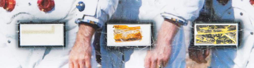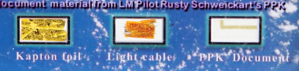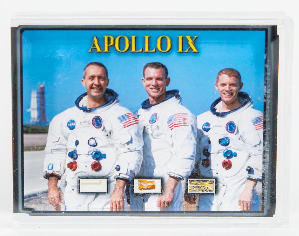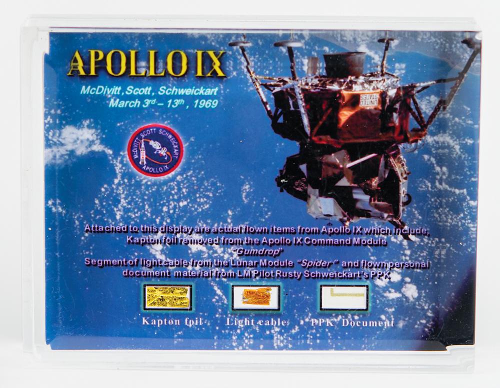 Desirable acrylic display featuring three small swatches of material attested to as being flown on Apollo 9, including a swatch of Kapton foil removed from the Command Module 'Gumdrop,' a segment of light cable from the Lunar Module 'Spider,' and a segment of flown document from LMP Rusty Schweickart's PPK. The acrylic block measures 3.75″ x 2.75″ x 1″. In fine condition, with some scuffing to the acrylic surface.