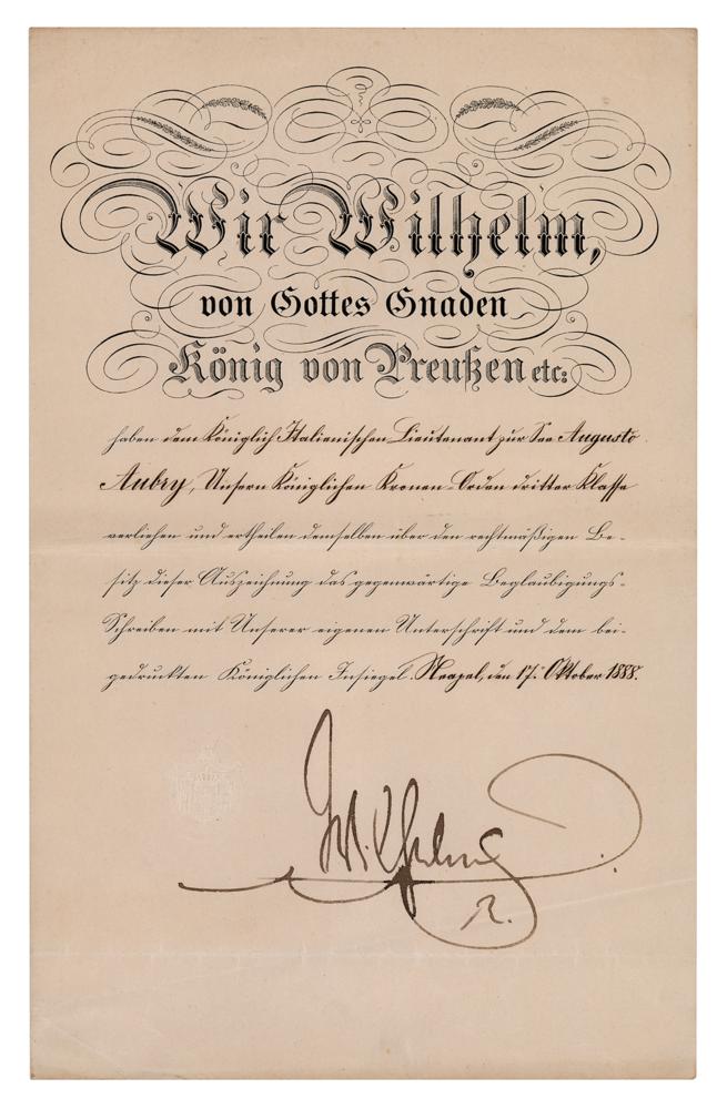 Partly-printed DS in German, signed “Wilhelm R,” one page, 8.25 x 13, October 17, 1888. Untranslated official document, prominently signed at the conclusion in ink by Kaiser Wilhelm II. In very good to fine condition, with some creasing in the signature area.