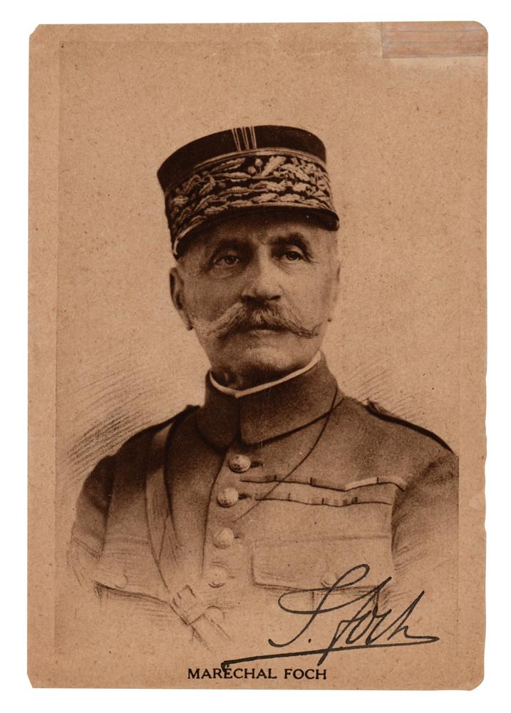 French military officer (1851-1929) who served as Supreme Commander of the Allied Armies in the final months of World War I. Vintage 3.75 x 5.5 postcard portrait of Marshal Foch in uniform, boldly signed in fountain pen, "F. Foch." In very good to fine condition, with a small area of repaired loss to upper right corner.