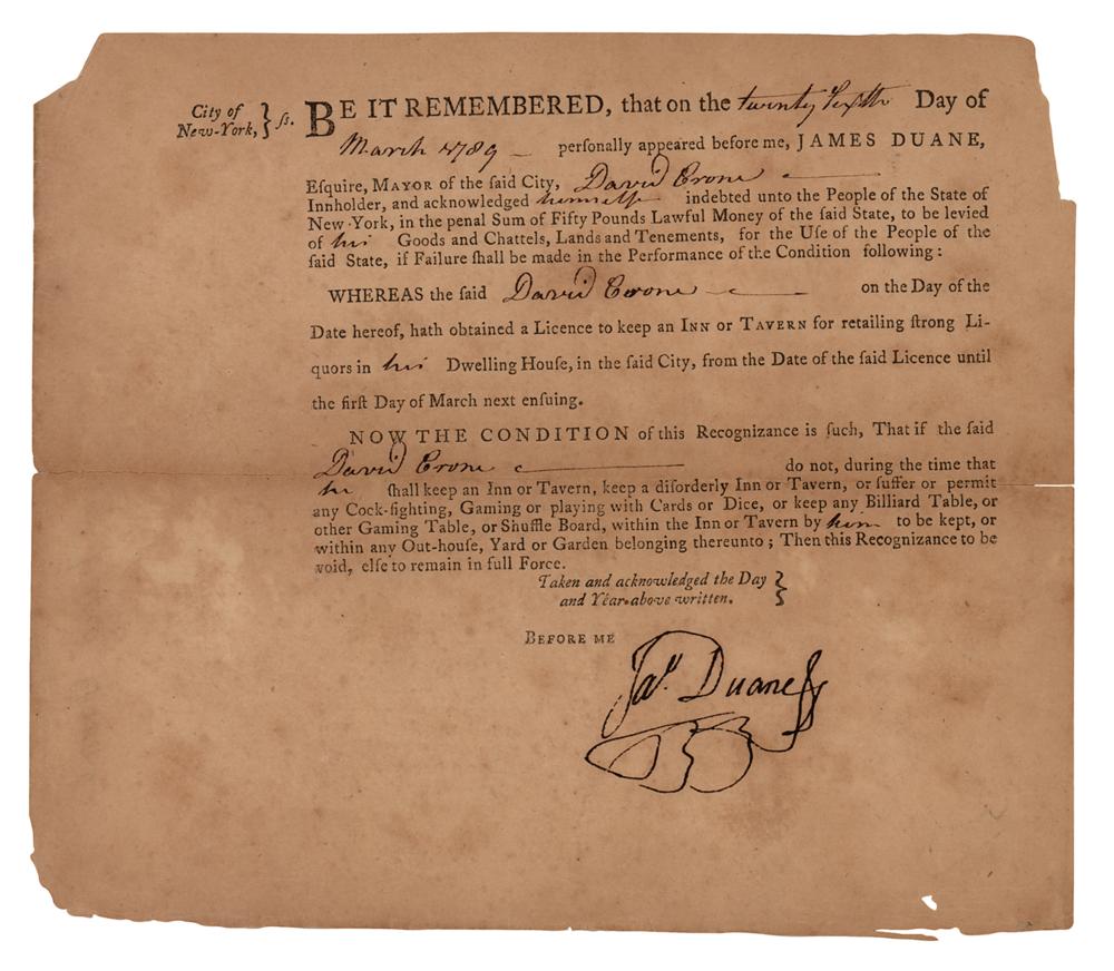 American Revolutionary leader from New York (1733-1797) who was a signatory of the Continental Association and the Articles of Confederation. Among his many posts, Duane served as a delegate to the Second Continental Congress and the Congress of the Confederation, as a New York state senator, the 44th Mayor of New York City, and the 1st post-colonial Mayor of New York City. Partly-printed DS, signed “Jas. Duane,” one page, 7.5 x 6.5, March 26, 1789. Document regarding the issuance of a "Licence to keep an Inn or Tavern for retailing strong Liquors in his Dwelling House," under the promise that he not "permit any Cock-fighting, Gaming or playing with Cards or Dice, or keep any Billiard Table." In very good to fine condition, with minor loss along the edges, and splitting to the central horizontal fold.