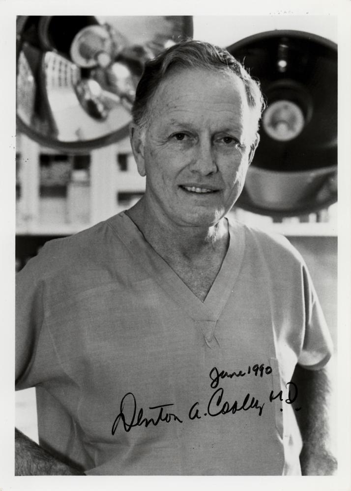 Glossy 5 x 7 photo of Cooley in his scrubs, signed in black felt tip, "June 1990, Denton A. Cooley, M.D." In fine condition, with a crease touching Cooley's right shoulder.