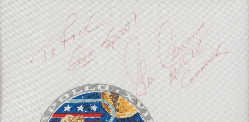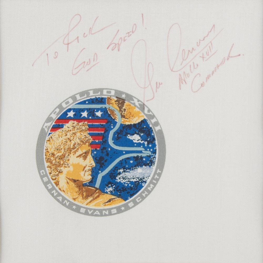 Swatch of Beta cloth, 7 x 7, featuring the Apollo 17 mission insignia, signed and inscribed in black felt tip, “To Rick, God speed! Gene Cernan, Apollo XVII, Commander.” Double-matted and framed to an overall size of 10.5 x 13.5. In fine condition, with slight fading to the handwriting.