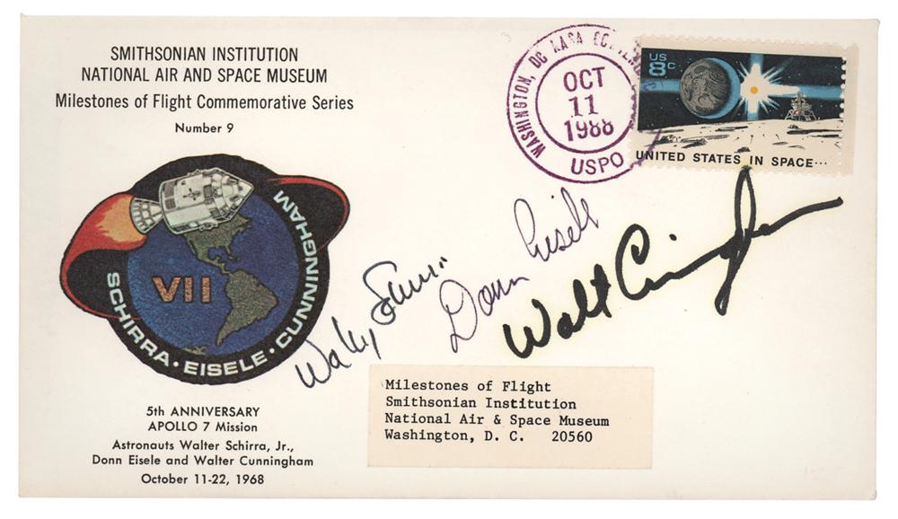 Smithsonian Institution National Air and Space Museum cover with a color cachet honoring the 5th anniversary of the Apollo 7 mission, signed in black ink by Wally Schirra and Donn Eisele, and in black felt tip by Walt Cunningham. In fine condition. Accompanied by a full letter of authenticity from Zarelli Space Authentication.