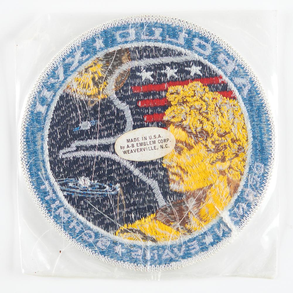 Very rare Apollo 17 ‘White Eagle’ crew patch, 4″ in diameter, fully embroidered with a merrowed border and 'tail.’ Reverse bears its original AB Emblem label. Sealed and in fine condition. The apparent scarcity of this patch infers that this version was produced for NASA directly and was never released to the general public. The ‘White Eagle’ patch is distinguished by the white thread used on the outline of the eagle, the pale blue thread in the border, and the white thread on the planet Saturn.