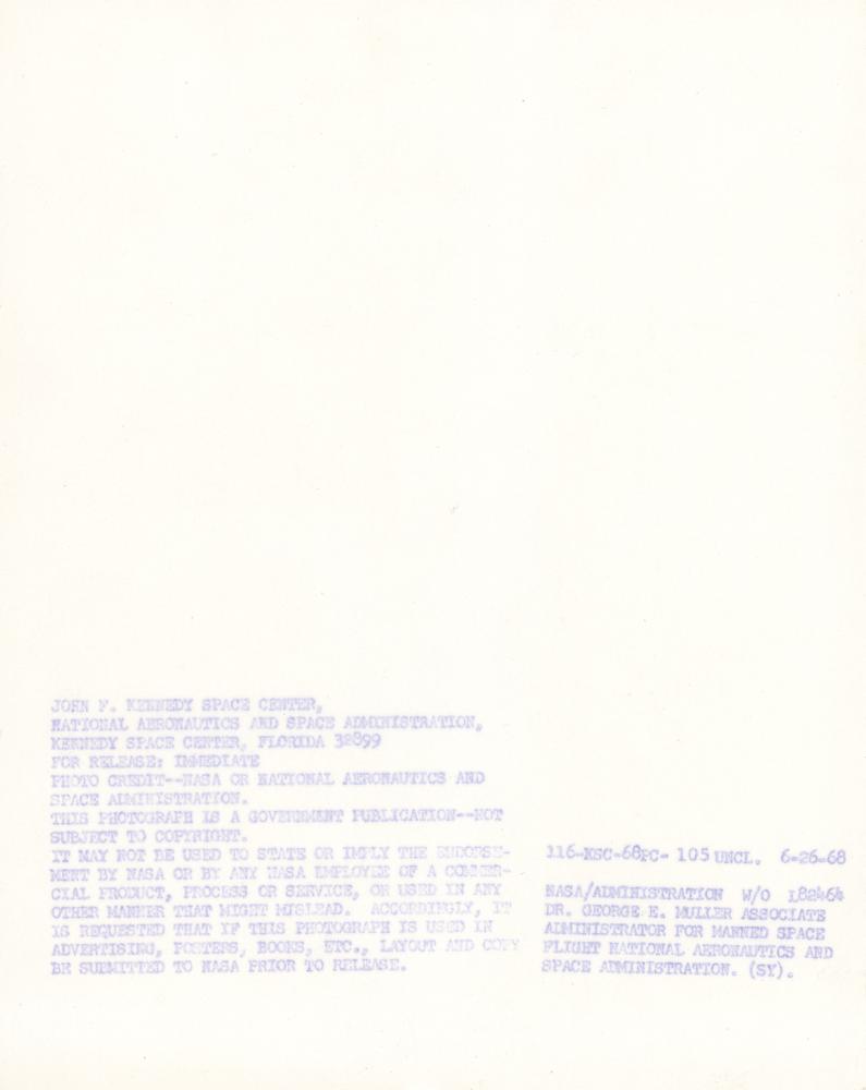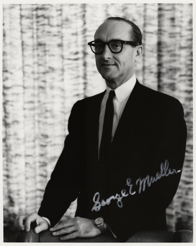 American electrical engineer (1918-2015) who was an associate administrator at NASA who headed the Office of Manned Space Flight from September 1963 until December 1969. He was instrumental in introducing the all-up testing philosophy for the Saturn V launch vehicle, which ensured the success of the Apollo program in landing a man on the Moon and returning him safely to Earth by the end of 1969. Mueller also played a key part in the design of Skylab, and championed the Space Shuttle's development, which earned him the nickname, ‘the father of the Space Shuttle.’ Official semi-glossy 7.75 x 9.75 NASA photo of the administrator of the NASA's Office of Manned Space Flight, signed in white ink, "George E. Mueller." Reverse bears NASA caption text. In fine condition.