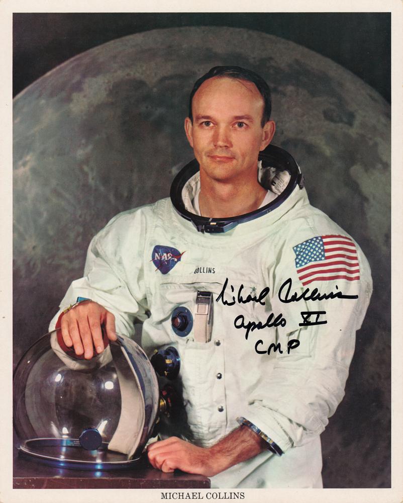 Official color 8 x 10 NASA lithograph of Command Module Pilot Collins posing in his white space suit against a lunar backdrop, signed in black felt tip, "Michael Collins, Apollo XI, CMP." In very fine condition.