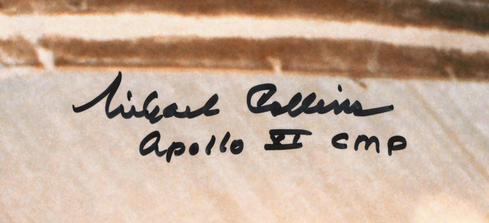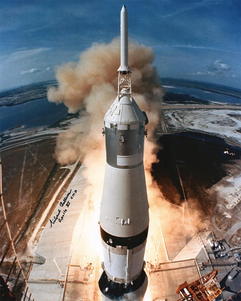 Color satin-finish 16 x 20 close-up liftoff photo of the Saturn V rocket that launched the historic Apollo 11 moon-landing mission, signed neatly in black felt tip, “Michael Collins, Apollo XI CMP.” In fine condition.