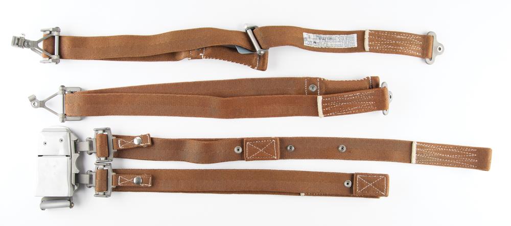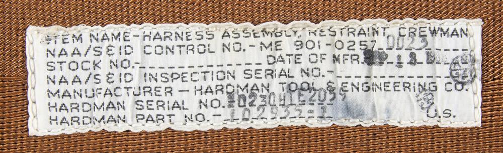 Apollo Command Module Block II crew restraint harness assembly, consisting of two brown nylon shoulder straps interfacing with the restraint harness buckle, plus two additional brown nylon restraint straps with metal brackets at the ends. One strap bears a sewn-on parts tag, reading: "Item Name—Harness Assembly, Restraint Crewman, NAA/S&ID Control No.—ME 901-0257-0023, Date of Mfr. Sep 13 1966, Manufacturer—Hardman Tool & Engineering Co., Hardman Serial No. 202308TE2059, Hardman Part No. 102935-1." In fine condition.