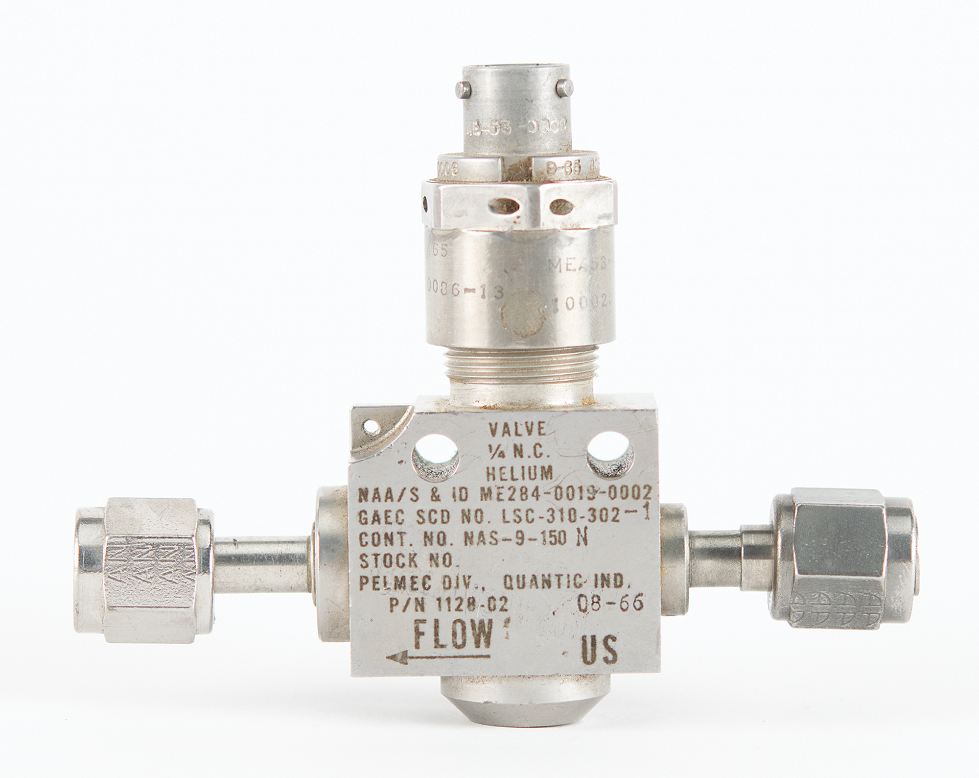 Apollo Command Module helium valve, measuring 3.75˝ x 2.75˝ x .75˝, marked on the body: "Valve, 1/4 N.C., Helium, NAA/S & ID ME284-0019-0002, GAEC SCD No. LSC-310-302-1, Cont. No. NAS-9-150N,…P/N 1128-02, 08-66." Also marked on the side: "V36-980, 106-121." The direction of flow is marked on the body. In fine condition.
