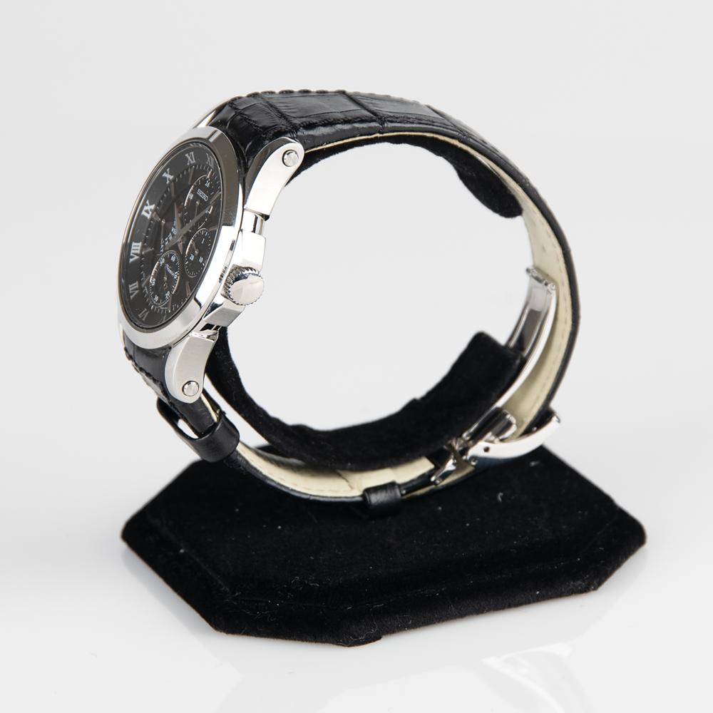 The handsome watch features a stainless steel case; scratch-resistant sapphire crystal; 60 second, 24 hour, day and date subdials; black dial with silver-tone hands, roman numerals and hour markers; precise quartz movement; and leather bracelet.