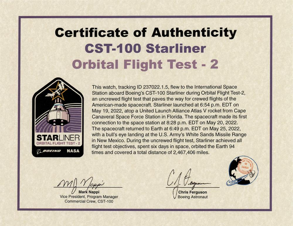 The OFT-2 mission marked the first time that both astronaut capsules of NASA's Commercial Crew Program—Boeing's Starliner and SpaceX's Crew Dragon—were simultaneously docked with the International Space Station. These spacecraft were developed in an effort to escape reliance on the Russia-controlled Soyuz crew transport vehicles. A highly desirable space-flown timepiece from a significant demonstration of the Starliner's capabilities.