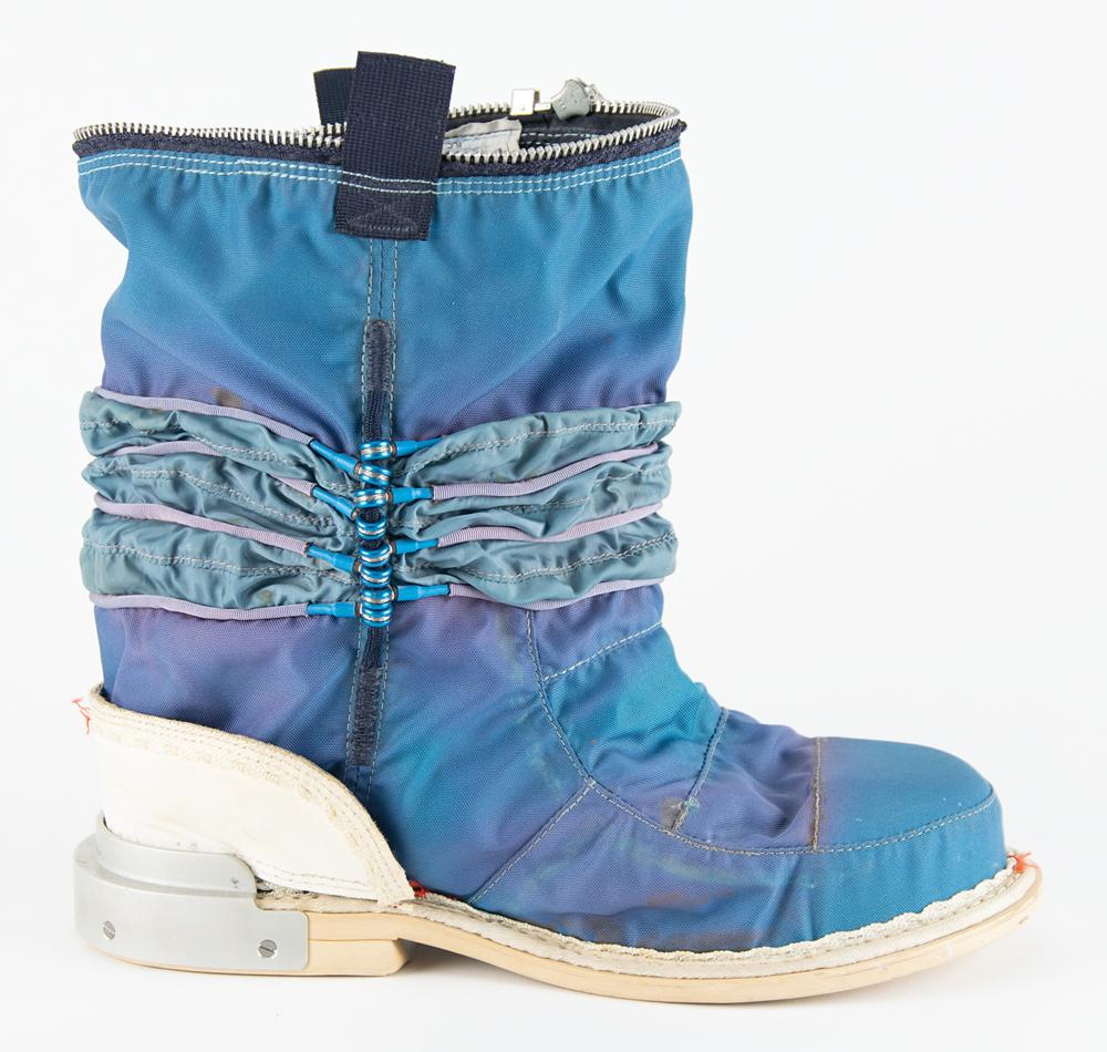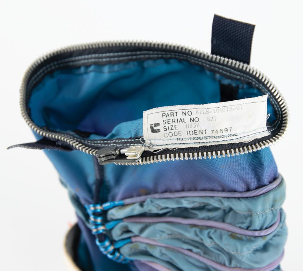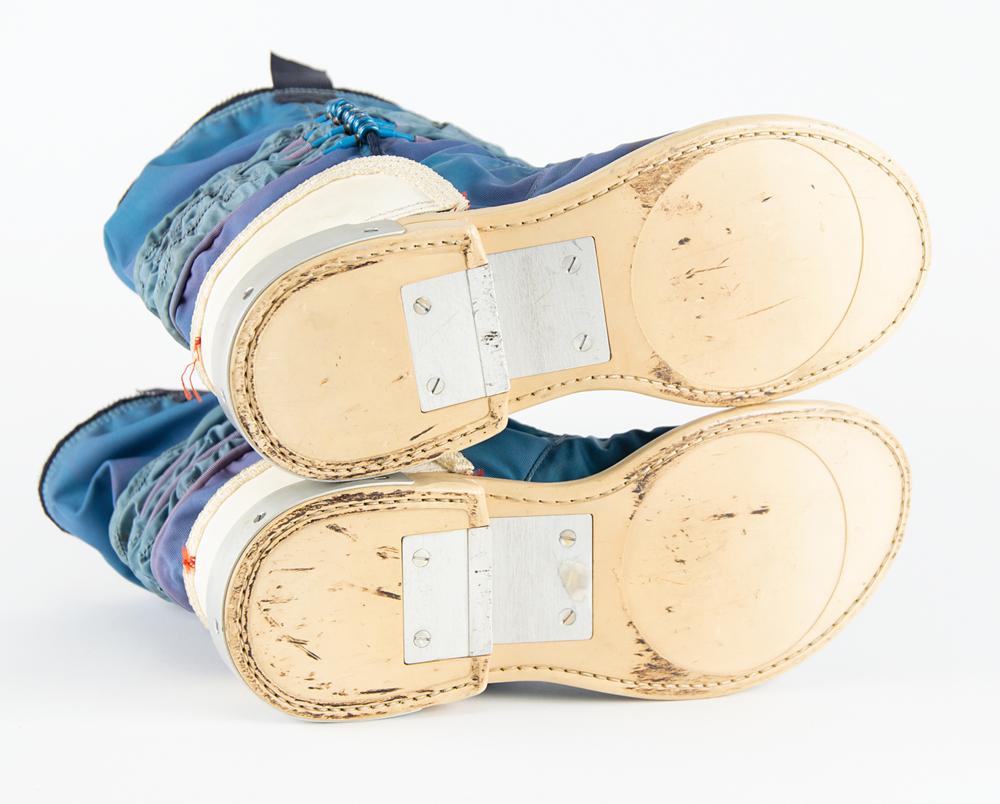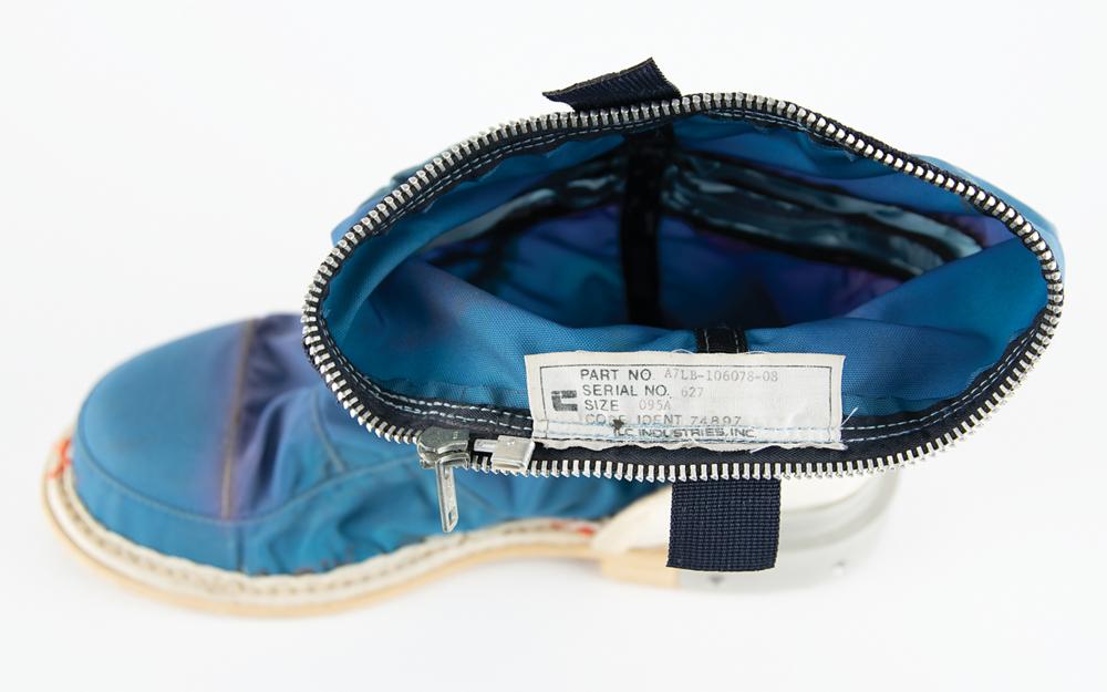 The A7LB space suit was made of several layers: these boots are part of the blue 'restraint' layer, known as the Torso Limb Suit Assembly (TSLA), which would be sandwiched in between the inflated pressure bladder and the iconic white Integrated Thermal Micrometeoroid Garment (ITMG) outer layer. The TSLA provided structural integrity to the suit by holding the internal suit pressure and contained the mobility elements that allowed the suit to move—thus permitting the astronauts to walk on the moon.