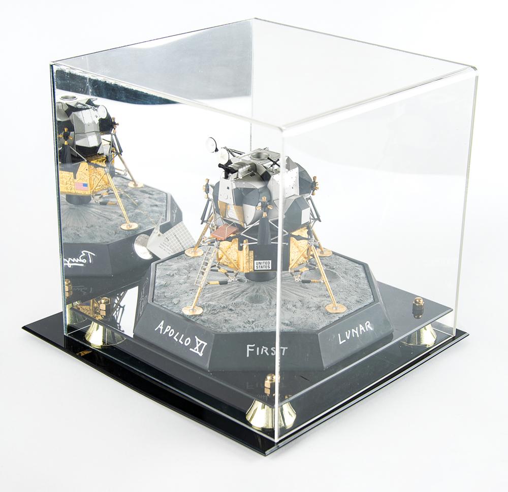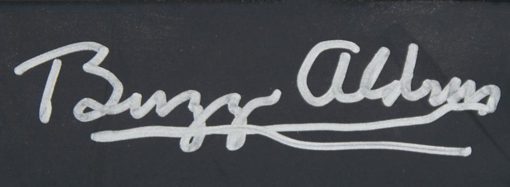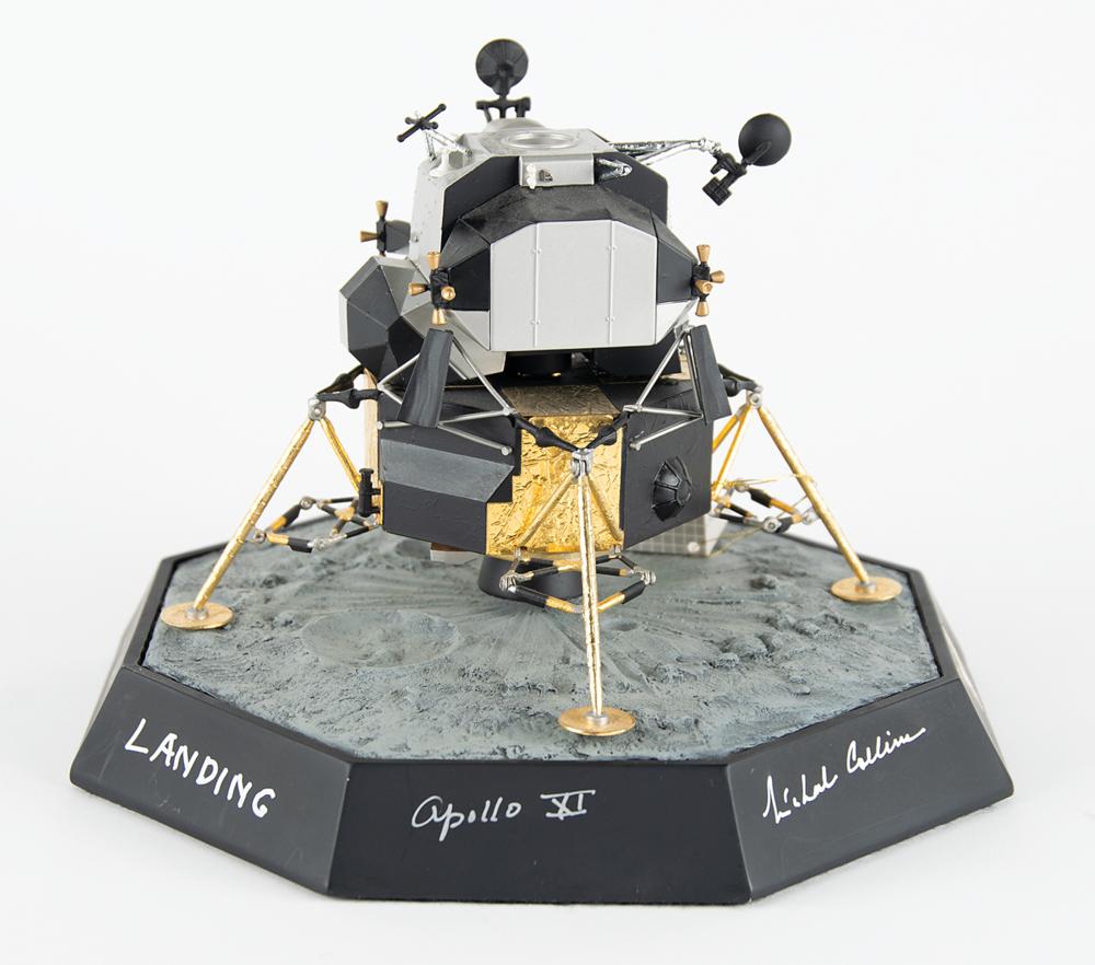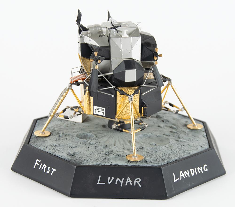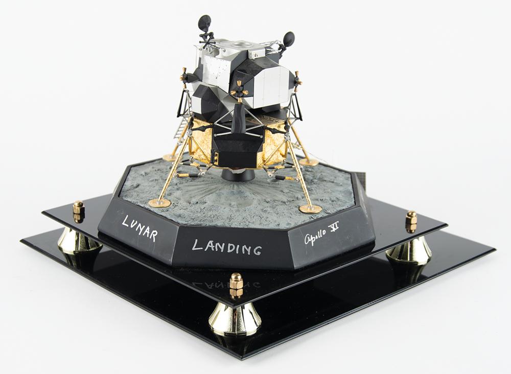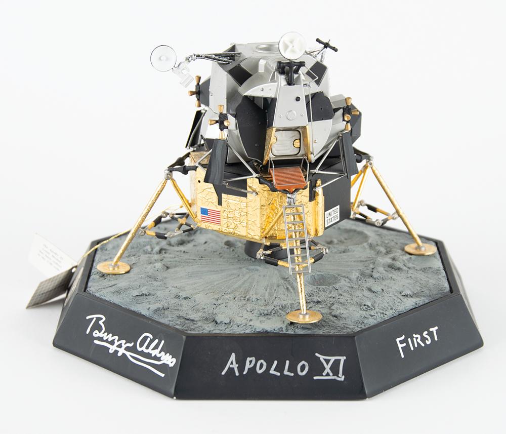 Beautiful 1:48 scale ‘precision model’ of the Apollo 11 Lunar Module ‘Eagle’ by the Franklin Mint, which was exclusively produced to celebrate the 25th anniversary of the first manned lunar landing. The detailed die-cast model measures 8″ x 7.5″ x 5.5″ and features retractable landing gear and heat insulation electroplated with 24-karat gold. The model is presented upon an attractive sculptured base of the lunar surface, 9.5″ x 9.5″ x 1″, which is signed along the edge in silver ink, “Michael Collins, Apollo XI” and “Buzz Aldrin, Apollo XI, First Lunar Landing.” Includes a custom presentation stand. In fine condition. Accompanied by a certificate of authenticity and a DVD from Astronaut Central for the respective signings.