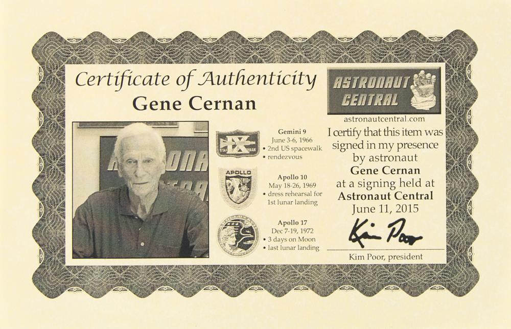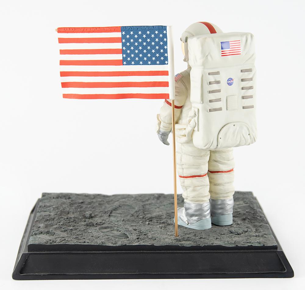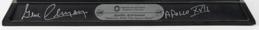 Attractive hand-crafted model entitled ‘Apollo Astronaut: America Wins the Space Race,’ produced by Code 3 Collectibles in cooperation with the National Air and Space Museum. Both the astronaut and the American flag approximately stand 9″ in height and are set on an attractive display base with a sculpted lunar terrain surface, 12″ x 9.5″ x 1.5″, which is signed on the front edge in silver ink, “Gene Cernan, Apollo XVII.” In fine condition. Accompanied by a certificate of authenticity from Astronaut Central.