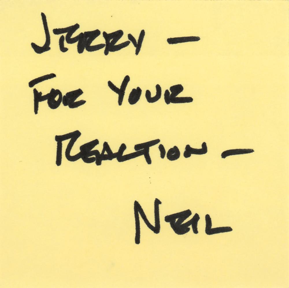 ANS signed “Neil,” on a yellow 3 x 3 Post-it sticky note, no date. A brief handwritten note in black felt tip from Armstrong, in full: "Jerry—For your reaction—Neil." In very fine condition. Accompanied by a full letter of authenticity from JSA.