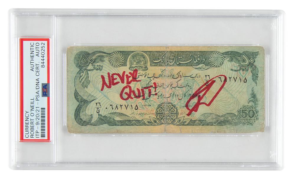 Decorated US Navy SEAL and special warfare operator (born 1976) who is best known for having fired the head shots that killed Osama bin Laden during Operation Neptune Spear. Currency from Afghanistan, signed in red felt tip by Rob O'Neill, who adds, "Never quit!" In very good to fine condition, with expected handling wear. Encapsulated in a PSA/DNA authentication holder.