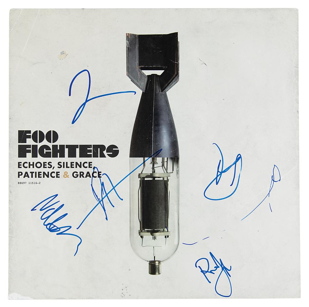 Echoes, Silence, Patience & Grace album flat signed in blue felt tip by Dave Grohl, Taylor Hawkins, Nate Mendel, Pat Smear, and Rami Jaffee. In very good condition, with overall creasing. Accompanied by a letter of provenance indicating that the promo flat was signed at the Rock & Roll Hall of Fame induction ceremony in Cleveland on April 18, 2015.