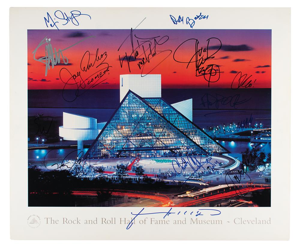 Color 24 x 20 poster of the Rock and Roll Hall of Fame in Cleveland, signed in felt tip by 14 popular music icons. Signers are: Stevie Wonder, Patti Smith, Dave Bartholomew, Mavis Staples, Billy gibbons, Darlene Love, Joey Ambrose, LL Cool J, Adam 'Ad Rock' Horovitz, Al Rex, Chuck D, Chubby Checker, Karen O, and Gary Clark, Jr. Affixed to a same-size foamcore mount and in fine condition. Consignor notes that the autographs were acquired in person, and a list of dates and locations of acquisition is included.