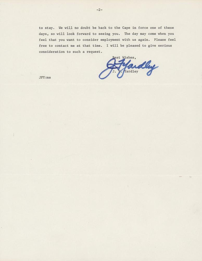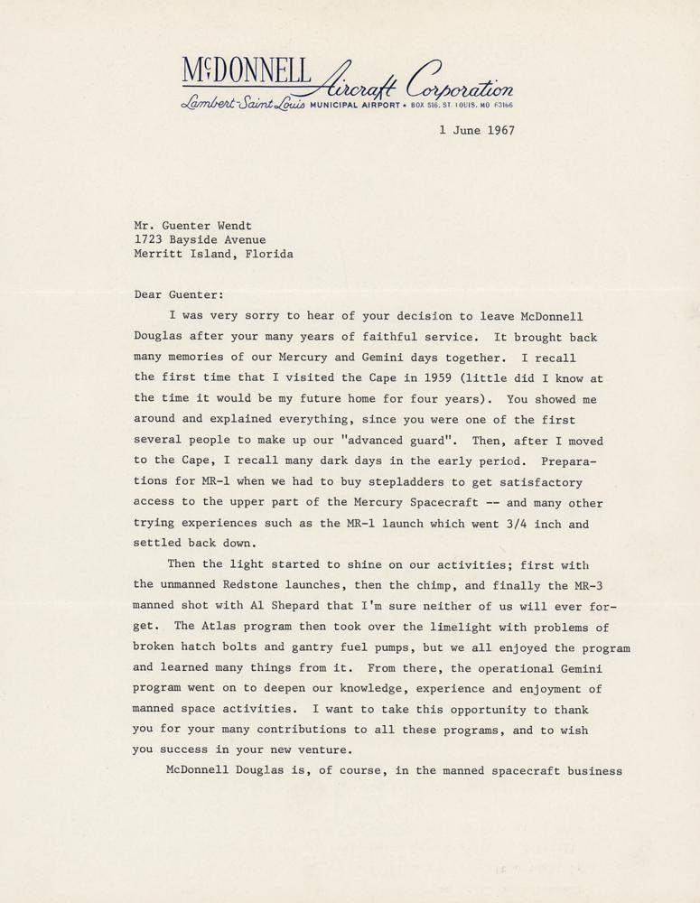 TLS signed “J. F. Yardley,” two pages, 8.5 x 11, McDonnell Aircraft Corporation letterhead, June 1, 1967. Significant letter to Guenter Wendt, thanking him for his service and wishing him well on his leaving McDonnell Aircraft Corporation to return to Cape Canaveral after the Apollo 1 fire. Yardley was an executive of McDonnell Douglas, which built the Mercury and Gemini capsules. They lost the contract for the Apollo command module to North American Aviation (Rockwell). NAA would not give Wendt complete authority as the Pad Leader so he refused the job and stayed with McDonnell, who reassigned him to a test range in Titusville. After the Apollo 1 fire, NAA hired Wendt to return as the Pad Leader and gave him the complete authority he required.