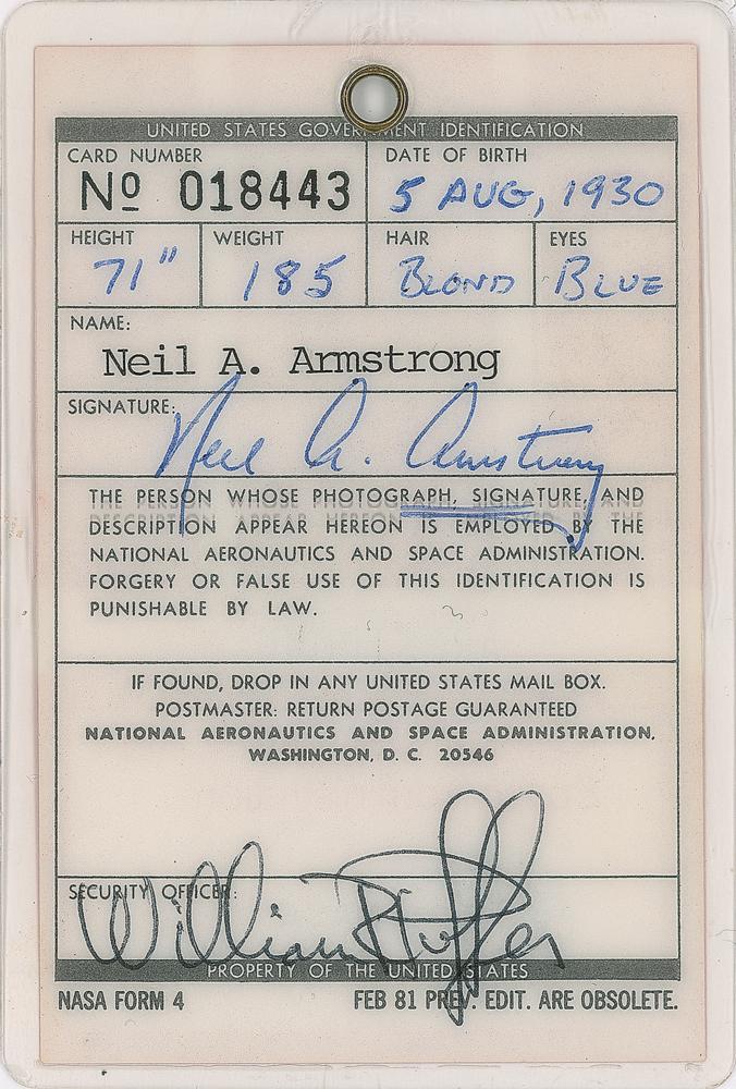 Amazing red-and-white laminated NASA Headquarters access badge, 2.75 x 3.75, issued to Neil Armstrong for his investigation into the STS 51-L Space Shuttle Challenger disaster, with the front bearing a color glossy 1.25 x 1.5 photo of "Armstrong," marked, “STS 51-L, INV.” The ID badge, card no. 018443, is signed on the reverse in blue ballpoint, “Neil A. Armstrong.” Armstrong also fills out the fields above in his own hand: Date of Birth (“5 Aug, 1930”), Height (“71″”), Weight (“185”), Hair (“Blond”) and Eyes (“Blue”). The lower portion is signed by a security officer. In fine condition. This is the only NASA-issued Neil Armstrong signed photo ID badge we have ever offered.
