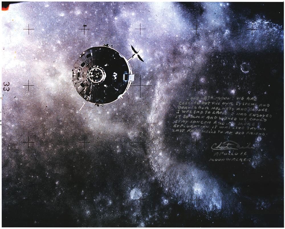 Color glossy 20 x 16 photo of the Command Module Casper soaring high above the moon during the Apollo 16 mission, signed in silver ink, "Charlie Duke, Apollo 16 moonwalker," who adds above: "Good-bye moon! We had checked out all our systems and donned our helmets and gloves. I was sad to leave. I had enjoyed it so much and wished we could stay longer and did more exploration. It was like saying last farewells to an old friend." In very good to fine condition, with a grainy quality to the photo and ink adhesion issues to the signature.