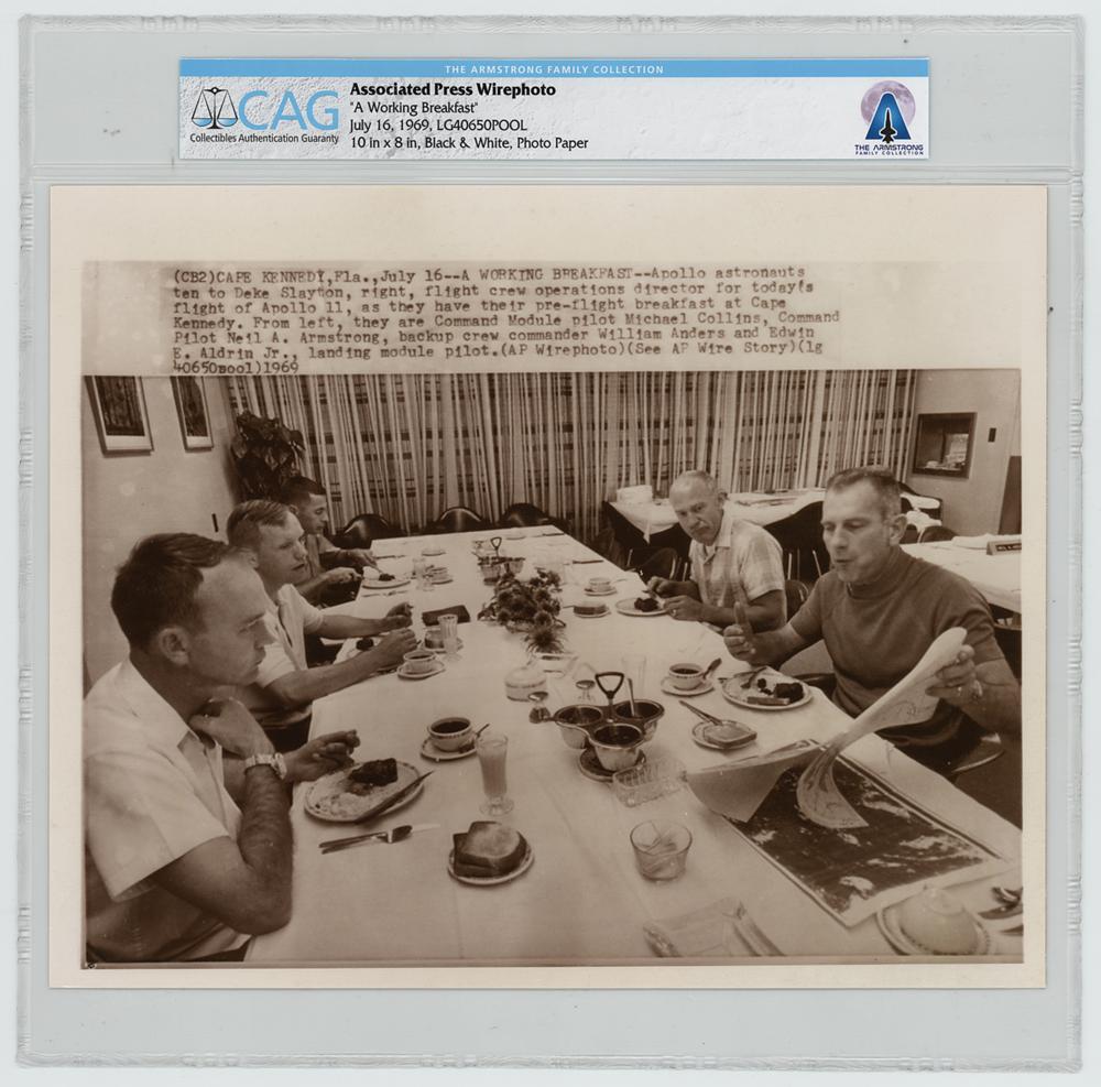 Neil Armstrong's original vintage glossy 10 x 8 AP wirephoto entitled 'A Working Breakfast,' showing the Apollo 11 crew sharing a pre-flight meal with Deke Slayton on the morning of their launch, July 16, 1969. In fine condition. Encapsulated by CAG as being from the Armstrong Family Collection.