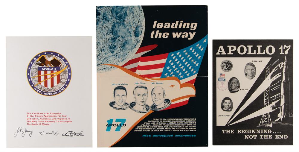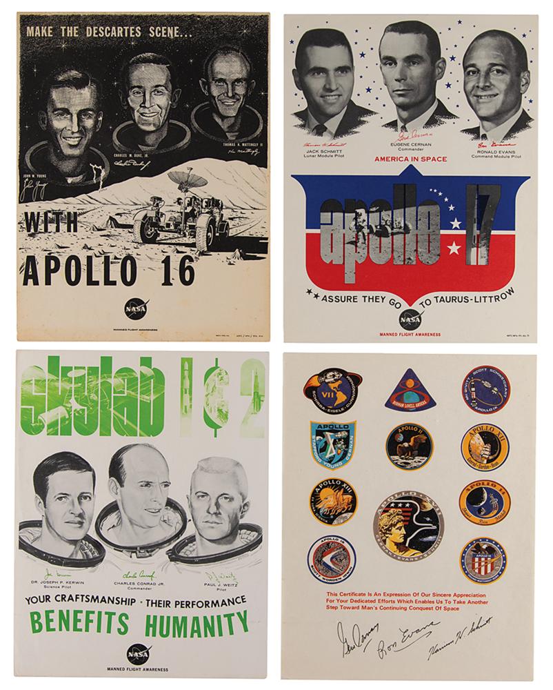 Group of 11 mini posters and certificates, most issued as part of the Manned Flight Awareness program, ranging in size from 8.5 x 11 to 11 x 14, covering missions including Apollo 14, Apollo 16 (3), Apollo 17 (5), Skylab 1 & 2, and Apollo-Soyuz. Several bear pre-printed facsimile signatures of the crews. In overall fine condition.