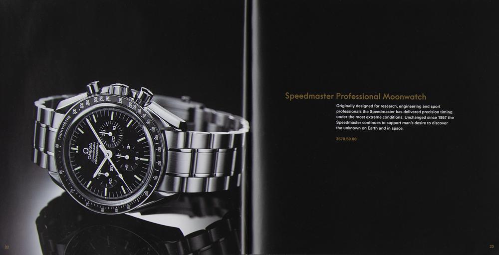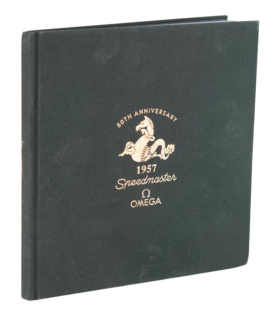 Uncommon hardcover book published in 1997 to celebrate the 50th anniversary of the Omega Speedmaster. Hardcover bound in black cloth with gilt-stamped design, 7.5 x 7.5, 79 pages. Profusely illustrated in full color, the book honors the history and legacy of the Omega Speedmaster and its tradition in space. In very good to fine condition, with some minor wear and creasing to inner pages.
