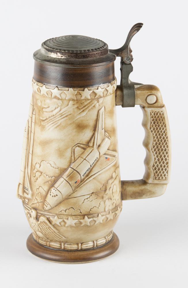 Three steins and mugs from the personal collection of Deke Slayton, including: an English-made Sheffield pewter stein featuring an Edwards Air Force Base emblem, engraved: "Flight Test Operations, Edwards AFB, 'Deke'"; a white ceramic mug featuring the Apollo-Soyuz logo on one side, with "Donald 'Deke' Slayton" emblazoned in gold on the other; and an impressive 1981 stein with raised depictions of the Space Shuttle in various configurations, marked on the bottom: "A handcrafted American Heritage Commemorative Stein, designed by Aladar Klubert, made by world famous Ceramarte in Brazil." In fine condition.