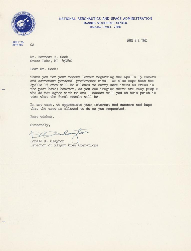 TLS signed “D. K. Slayton,” one page, 8 x 10.5, NASA letterhead, August 22, 1972. Letter to Forrest E. Cook, in full: "Thank you for your recent letter regarding the Apollo 15 covers and astronaut personal preference kits. We also hope that the Apollo 17 crew will be allowed to carry some items as crews in the past have; however, as you can imagine there are many people who do not agree with me and I cannot tell you at this point in time what the final result will be. In any case, we appreciate your interest and concern and hope that the crew is allowed to do as you requested." In fine condition.
